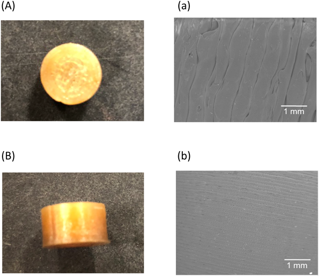 Preparation of Drug Loaded FilamentsA total of 100 g of drug and polymers were manually mixed (mixture composition: 20% ITZ, 65% HPC, 15% PVP) in a polyethylene bag for 5 min. The blended physical mixture was loaded into a single-screw extruder (Filabot Original EX2, Filabot, VT, U.S.A.). The extruder was operated at 35 rpm and the mixtures were extruded at 135°C through a 1.75-mm nozzle. For the fabrication of an object using FDM 3D printer, the filament needs to be fed into a heating nozzle by feeding gear. To achieve continuous high-throughput FDM printing, the mechanical property of the filaments is very important. When the filament is too soft, it is squeezed aside by the gear. In contrast, when the filament is too brittle, it is broken by the feeding gear.21,22) In this study, when the content of PVP was low, the filament was too soft, and when the content of PVP was high, it was too brittle to fabricate using FDM 3D printer. When the filaments contained drug and polymers above mentioned compounding ratio (20% ITZ, 65% HPC, 15% PVP), they were feedable and used for further study.