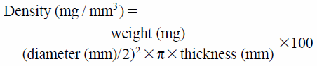 Characterization of TabletsThe thickness and diameter of tablets were measured using a digital caliper (digimatic caliper 500-302, Mitutoyo Co., Ltd., Kanagawa, Japan) (n = 10). The weights of the tablets were measured using an electronic balance (AT200, Mettler-Toledo, Columbus, OH, U.S.A.) (n = 10). Density was calculated according to the following equation.