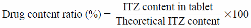 The crushing strength of the tablets was measured as the tablet hardness using a hardness tester (DC-50, Okadaseiko Co., Ltd., Tokyo, Japan) (n = 10). To determinate the drug content, one tablet was placed in a conical flask containing 100 mL of acetonitrile under magnetic stirring until complete dissolution. The concentration of the solutions was measured with HPLC (2010C-HT, Shimadzu Corporation, Kyoto, Japan), using a C18 column (150 × 3 mm 3 µm), maintained at 40°C. The flow rate of the mobile phase consisting of 70% of acetonitrile and 30% of water was 0.3 mL/min and the detection was performed at a wavelength of 236 nm (n = 3). The drug content ratio was calculated according to the following equation.