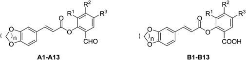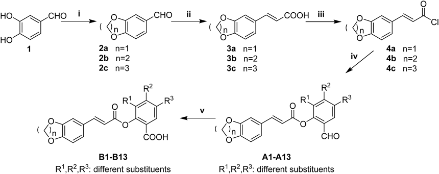 According to Chart 1, 3,4-dihydroxybenzaldehyde 1 was mixed with the corresponding dibromoalkane and K2CO3 in acetone or N,N-dimethylformamide (DMF) to obtain compounds 2a–2c as the major intermediates. Subsequently, the cyclized cinnamic acids (3a–3c) were prepared by the Knoevenagel condensation reaction, in which compounds 2a–2c can react with malonic acid in the presence of pyridine and piperidine, respectively. After the three cinnamic acids were converted to the corresponding acyl chlorides 4a–4c, the solution of acyl chloride 4a–4c in CH2Cl2 or ethyl acetate (EtOAc) at ice-bath under an inert atmosphere (N2) were added into selected salicylic aldehydes for the synthesis of the required caffeoyl salicylaldehydes. The aldehyde group of compounds A1–A13 can be oxidized to the acid group by the Pinnick oxidation reaction: the caffeoyl salicylates B1–B13 (Table 1) were prepared by the oxidation of compounds A1–A13 under sodium chlorite (NaClO2) in tert-butyl alcohol or tetrahydrofuran (THF). The chemical structures of all new caffeoyl salicylates were characterized by 1H-NMR spectra and general mass spectra (electrospray ionization (ESI)-MS). Besides, all the intermediates such as 2a–2c and 3a–3c had been characterized in the previous study.8)