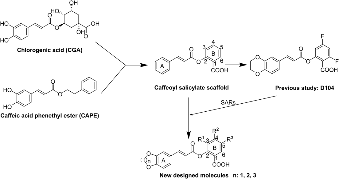 As shown in Fig. 1, we described that the most anti-inflammatory activity compound D104 was screened by a series of caffeoyl salicylate analogs designed by scaffold hopping method based on the chemical structure of CGA and caffeic acid phenethyl ester (CAPE) in the previous study.8) The structure–activity relationships (SARs) of these compounds presents that: A) compounds with 5- or 6-member oxygen-containing ring can exhibit superior potency to compounds with 7- or 8-member oxygen-containing ring; B) electron withdrawing groups of B ring contributed more to anti-inflammatory activity than electron donating groups or no substituent; C) caffeoyl salicylaldehydes generally have potent cytotoxicity, compared to caffeoyl salicylates. Nevertheless, the kinds, quantity and position of substituents seem to be kind of limited. The improvement for anti-inflammatory activity based on the scaffold still has great potential.