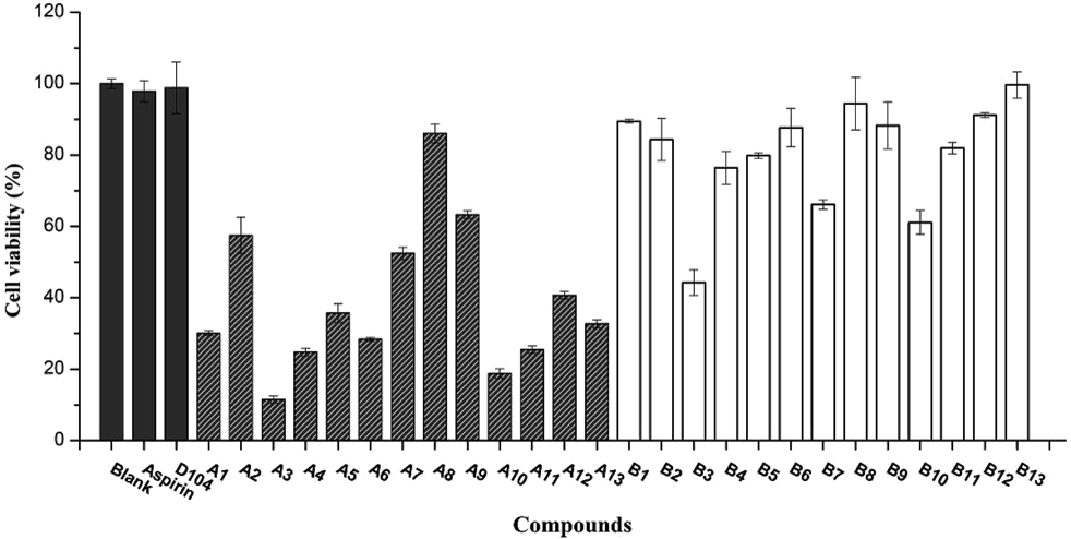 Most caffeoyl salicylaldehyde compounds (A1–A13) did significantly affect cell viability. Data was represented by the mean ± standard error (S.E.) of the three independent experiments.