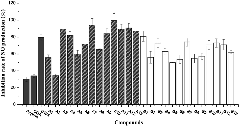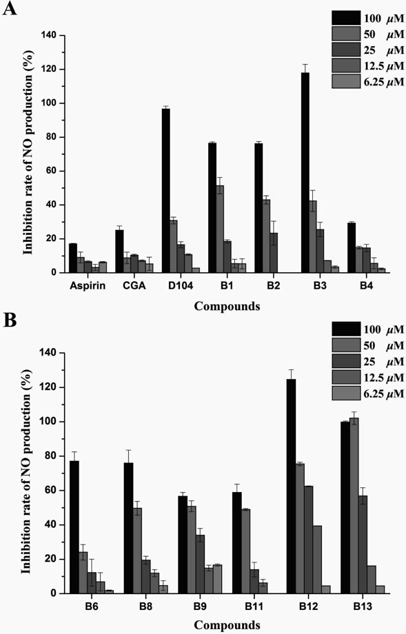 Compounds A1–A13, B1–B13, D104, CGA, and acetylsalicylic acid (Aspirin) were dissolved in dimethyl sulfoxide to make stock solutions, respectively, and kept at −20°C. The final concentration of the vehicle in the solution never exceeded 0.1% and had no effects on NO production and cell viability.