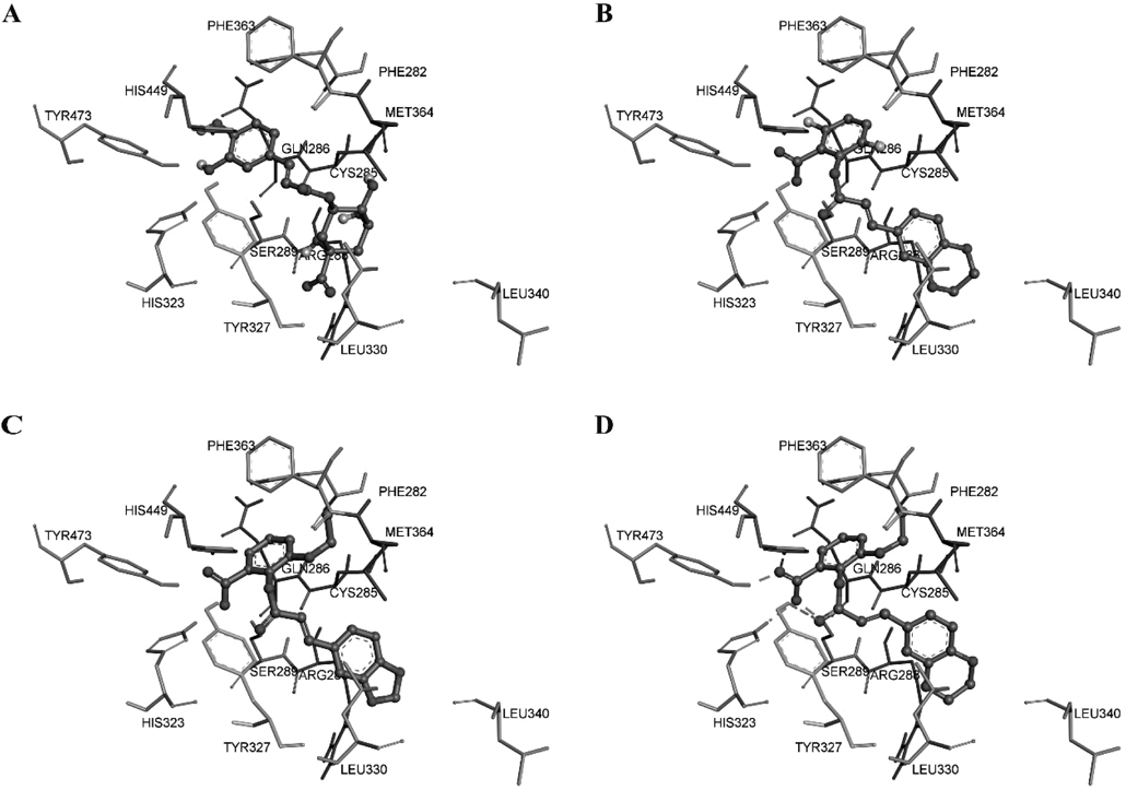 Previous study demonstrated that the caffeoyl salicylate scaffold was obtained by virtual screening using the Glide docking study11) on the basis of the peroxisome proliferator-activated receptor γ (PPARγ) protein.12) Accordingly, docking study of the two most active compounds B12 and B13, together with D104 and CGA, were performed to identify the possible binding mode at the active pocket of PPARγ protein (PDB ID: 3U9Q). The docking results can be provided in Fig. 6, which displayed that the three caffeoyl salicylates (D104, B12, and B13) can follow the same binding mode in the pocket, although CGA adopted the reverse orientation completely. Comparing with each other from Fig. 6A to D, the four molecules can insert into the cleft located at the active pocket of PPARγ protein in a linear manner. Besides, the docking scores of B12 and B13 were both better than that of D104.