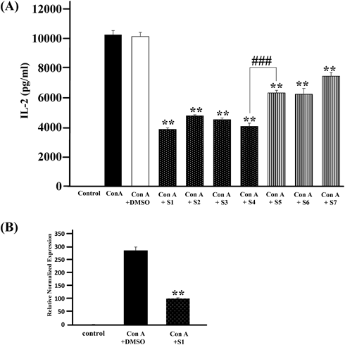 StatisticsResults are expressed as the mean ± standard error (S.E.) The statistical significance of difference between two groups was calculated by unpaired Student’s t-test. The statistical significance of differences between positive control (Con A- or TCR-stimulated group) and other groups was calculated by using Dunnett’s test with the Instat version 3.0 statistical package (GraphPad Software, San Diego, CA, U.S.A.). The criterion of significance was set at p < 0.05 (* p < 0.05, ** p < 0.01, ### p < 0.0001).