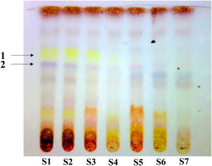 Development solvent; CHCl3–MeOH (4 : 1, v/v), detection; spraying with diluted sulphuric acid solution, followed by heating at 105°C. (Color figure can be accessed in the online version.)