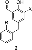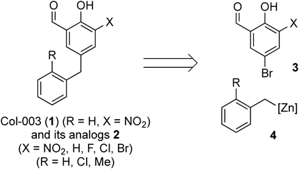 To elucidate the substituent effects of Col-003 (1), we designed analogues 2 that possess a halogen atom instead of a nitro group and a 2-methyl- or 2-chlorobenzyl group as a pendant moiety for inducing steric and electronic effects with an ortho-substituted aromatic ring. Analogues 2 can be prepared through the Pd(0)-catalyzed cross-coupling reaction of 5-bromosalicylaldehyde 3 with benzylzinc reagents 4, as shown in Chart 1.