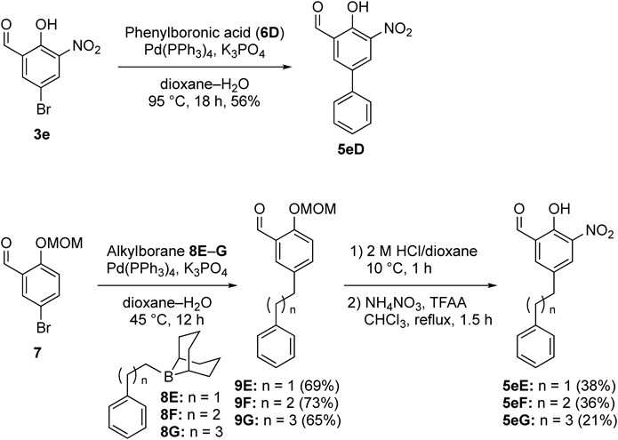 Because the pendant benzyl moiety in 1 was found to be important in potent inhibitory activity, we next investigated the synthesis and inhibitory activity of the nitrated analogues possessing alkyl linkers of different lengths between two aromatic rings in 1, and their syntheses are summarized in Chart 2. Suzuki–Miyaura cross-coupling of aryl bromide 3e with phenylboronic acid (6D) was smoothly performed in the presence of Pd(PPh3)4/K3PO4 to provide the corresponding biphenyl analogue 5eD with 56% yield. In addition, the analogues 5eE–5eG possessing alkyl linkers of different lengths were prepared using Suzuki–Miyaura cross-coupling. However, the reactions of 3e with (phenylalkyl)boranes22) 8E–8G were problematic because a complex mixture was afforded in the presence of a 3-nitrosalicylaldehyde moiety, and the reaction of the simpler aryl bromide 3a also failed to afford the corresponding products. Thus, we utilized a phenol-protected aryl bromide 7 to promote Suzuki–Miyaura cross-coupling leading to the formation of Col-003 analogues 5. Eventually, the methoxymethyl (MOM)-protected aryl bromide 7 was readily coupled with 8E–8G under ambient conditions (45°C, 12 h) to provide 9E–9G in moderate to good yields. After removal of the MOM group under acidic conditions, ortho-nitration of the resulting phenols using NH4NO3/TFAA provided the desired analogues 5eE–5eG in moderate yields.