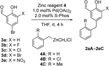 One-step synthesis of analogues 2a–2e with the Pd(0)-catalyzed Negishi cross-coupling reaction was attempted, and the results are presented in Table 1. The reaction of 5-bromosalicylaldehyde (3a)14) (X = H) with benzylzinc reagents15)4A–C (R = H, Cl or Me) was performed in the presence of a catalytic amount of Pd(OAc)2/S-Phos at room temperature to afford the desired 2aA–2aC (entries 1–3). Similarly, reactions of 5-bromo-3-fluorosalicylaldehyde (3b)16) and 5-bromo-3-chlorosalicylaldehyde (3c)17) with benzylzinc reagents 4A–C successfully provided the corresponding analogues 2bA–2bC and 2cA–2cC in moderate to good yields (entries 4–9). Alternatively, all the reactions of 3,5-dibromosalicylaldehyde (3d)18) and 5-bromo-3-nitrosalicylaldehyde (3e)19) with 4A–4C resulted in a complex mixture (entries 10–15), probably because 3d has two reactive bromide atoms, which might have made the regioselective reaction difficult, and 3e would undergo nucleophilic addition of the organozinc reagents to an aldehyde moiety activated by an adjacent highly electron-withdrawing NO2 group.