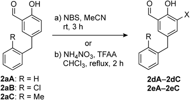 Next, we employed ortho-bromination and ortho-nitration of phenols in the coupling products 2aA–2aC. Treatment of 2aA–2cA with NBS/MeCN or NH4NO3/trifluoroacetic anhydride (TFAA)20) provided the brominated analogues 2dA–2dC or nitrated analogues 2eA–2eC, respectively (Table 2).