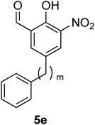 General Procedure: Synthesis of Col-003 Analogues 2e by ortho-NitrationTo a suspension of 2a (1.0 equiv) and NH4NO3 (2.0 equiv) in chloroform (7 mL/mmol) was added trifluoroacetic anhydride (TFAA) (8.0 equiv) at 0°C under an argon atmosphere. After being stirred in reflux for 2 h, the reaction mixture was cooled to room temperature and diluted with H2O. The organic layer was separated, and the water layer was extracted three times with chloroform. The combined organic layers were washed with brine and dried over MgSO4. The filtrate was concentrated in vacuo, and the resulting residue was purified by column chromatography on silica gel (eluted with hexane/EtOAc = 8 : 1) to afford the 3-nitrosalicylaldehyde derivative 2e.