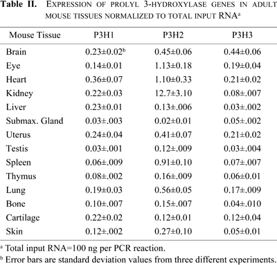 The aim of the present work was to study the expression patterns of the three prolyl 3-hydroxylase genes in adult and fetal mouse tissues in order to determine in vivo sites expressing the prolyl 3-hydroxylase enzymes and to identify tissues most likely to be affected by their loss of function.