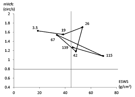 Stress-velocity relationship (mVcfc-ESWS relationship). The numbers shown to the side of the ● indicate hours after birth. Over the time course, the relationship was always within the normal range. We speculate that there was no left ventricular pump dysfunction due to excessive afterload, but somehow, the pulmonary venous pressure increased, which may lead to pulmonary edema. ESWS, end-systolic wall stress; mVcfc, mean fiber shortening velocity.