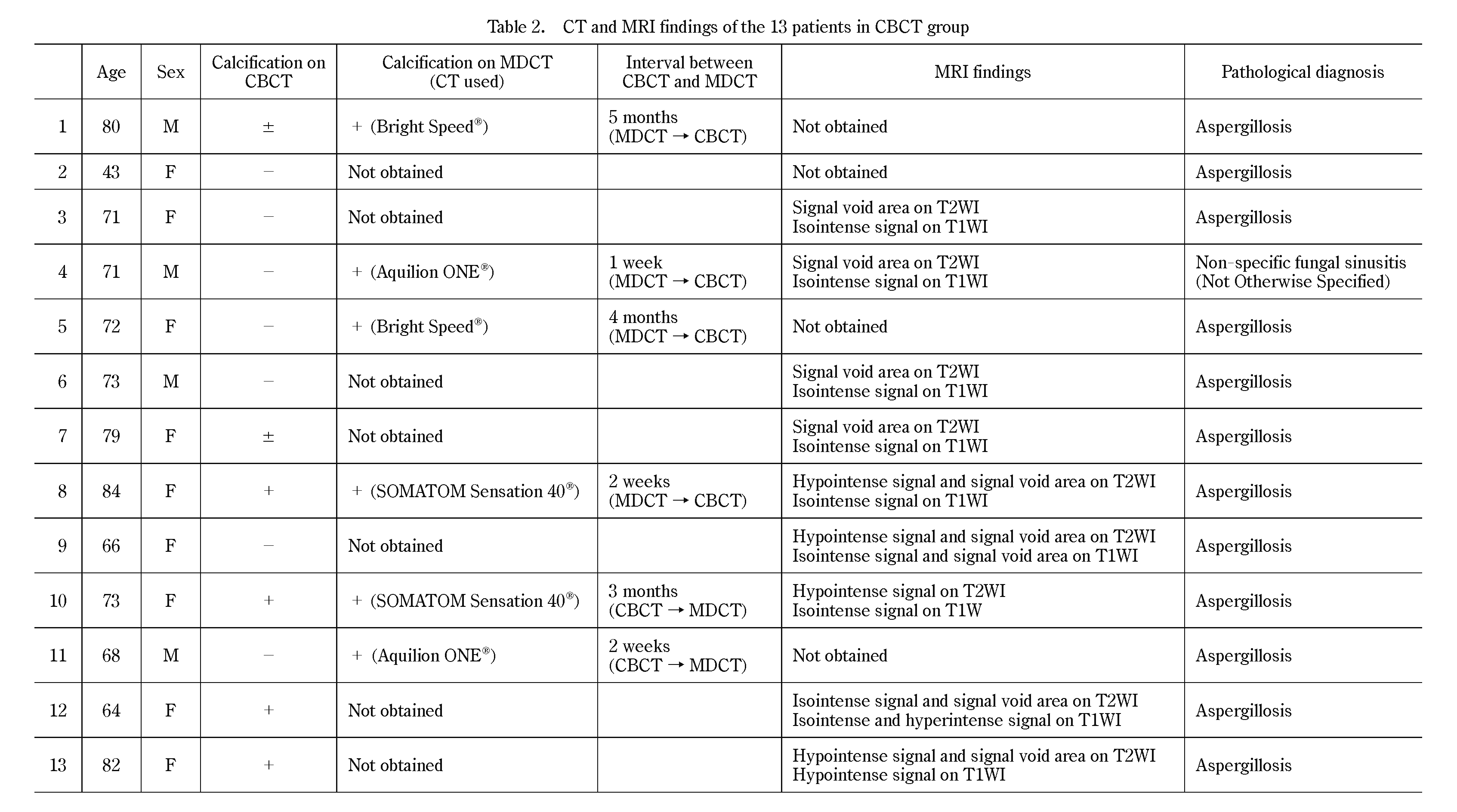 Intrasinus calcification was present in six of the 13 patients (46.2%) and 32 of the 38 patients (84.2%) in the CBCT and MDCT groups, respectively. Detection of intrasinus calcification was higher in the MDCT group (p=0.01) (Table 1). The CT and MRI findings in the CBCT group are summarized in Table 2, which also includes MDCT findings of the following patients; four patients who had been received MDCT by neighborhood otolaryngologists before the referral and two patients who received MDCT (Aquilion ONE®) to confirm the absence of intrasinus calcification as that was not detected on CBCT.
