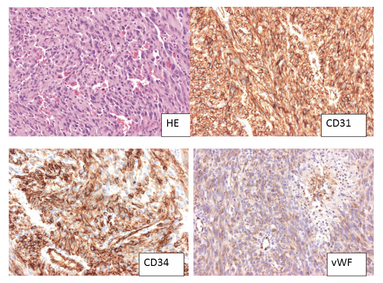 Hematoxylin and eosin staining revealed extensive invasion of aberrant type spindle tumor cells. The endothelial markers, including CD31, CD34, and von Willebrand factor were positively expressed by immunochemical staining (×200).