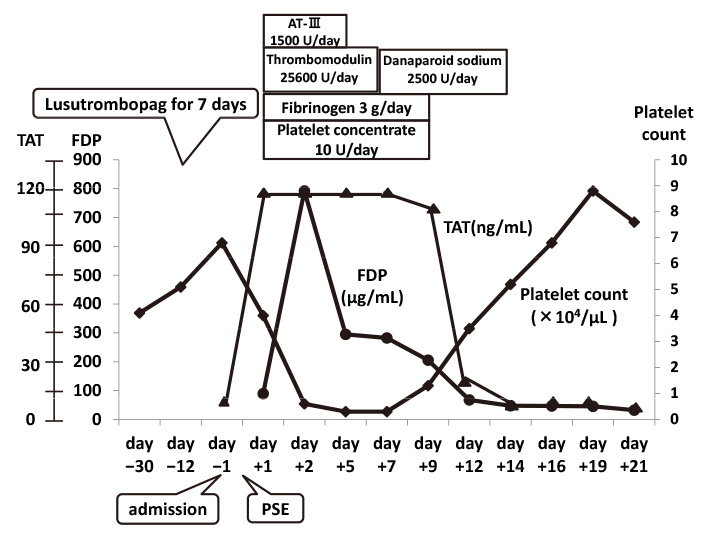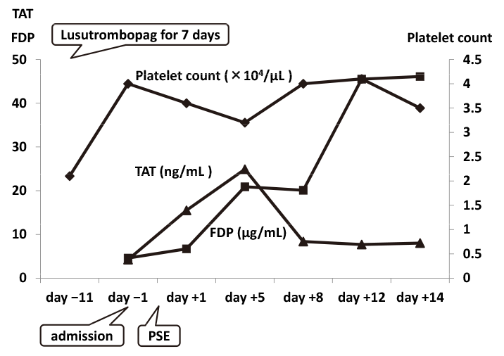 Lusutrombopag led to an increase in platelet count. The patient developed severe disseminated intravascular coagulation (DIC) post-partial splenic embolization (PSE), and severe thrombocytopenia and increases in fibrinogen degradation products and thrombin-antithrombin complex (TAT) levels were noted. TAT increased from 4.5 ng/ml to more than 120 ng/ml on day +1 and remained this high until day +7. DIC was resolved with medication and platelet transfusion. After cure of DIC, the platelet count became higher than the value obtained on admission.