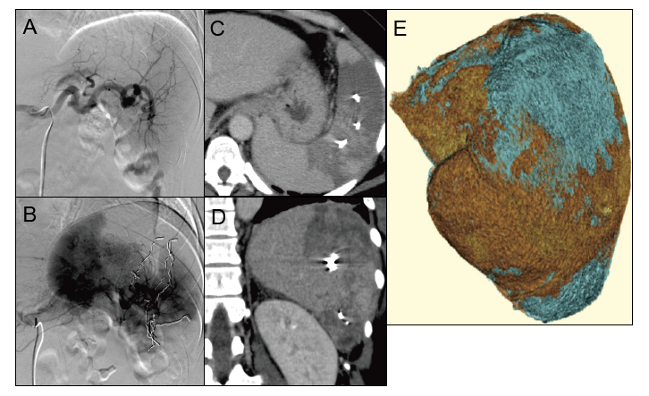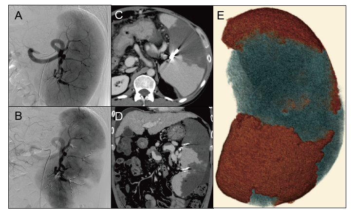 E:Three-dimensional image of the spleen. The red and blue areas indicate non-embolized (706.35 cc) and embolized (211.41 cc) areas, respectively. Post-PSE CT imaging revealed the embolization rate to be 23%.
