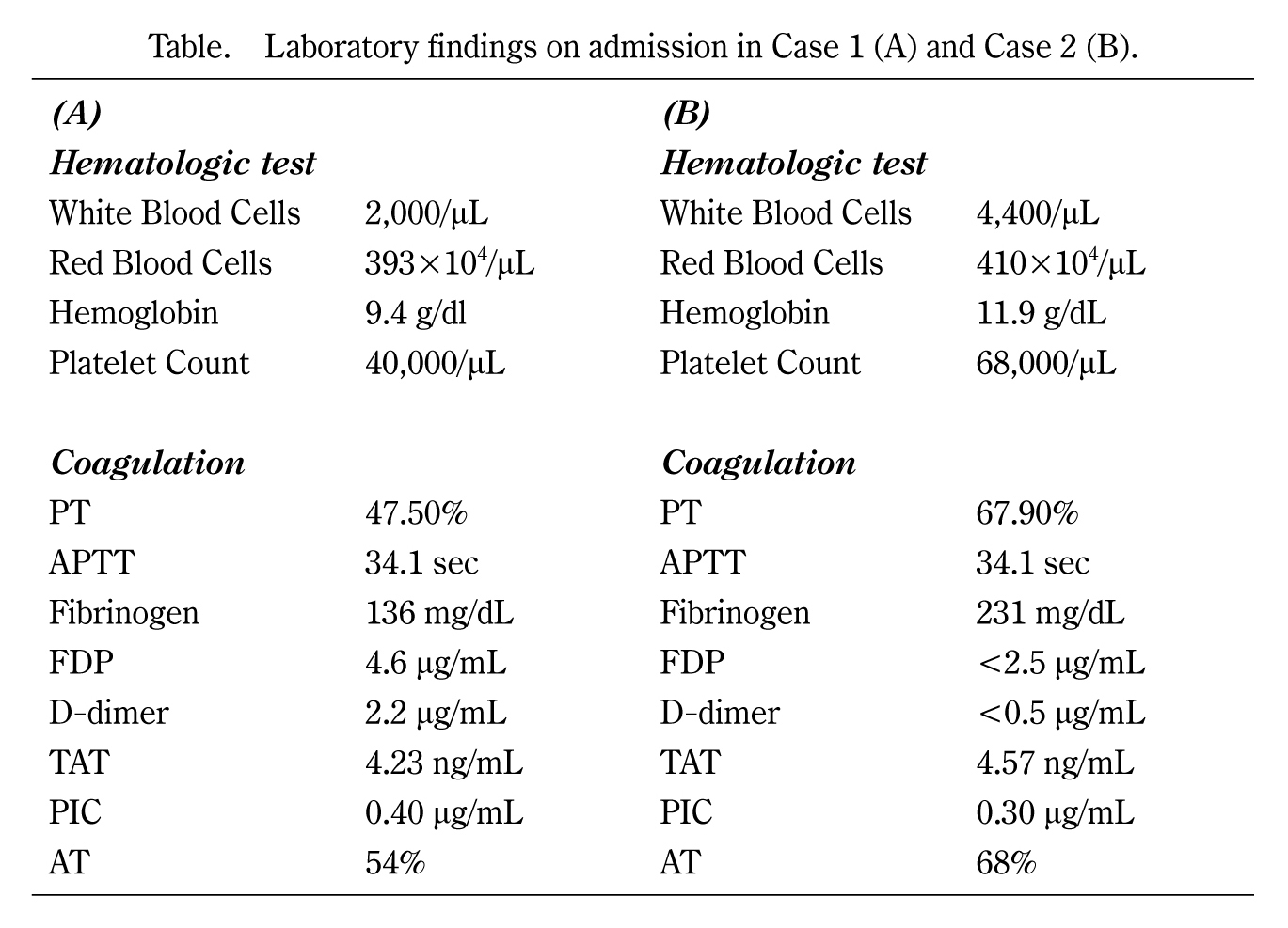 Laboratory findings on admission in Case 1 (A) and Case 2 (B).
