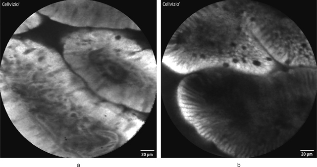 a:fluorescein静脈投与後の十二指腸正常絨毛の共焦点内視鏡所見.間質内の微小血管内を蛍光色素剤が流れることによって,血管の輪郭が白色明調に描出され,血管内を流れる暗調の赤血球がリアルタイムに観察される.