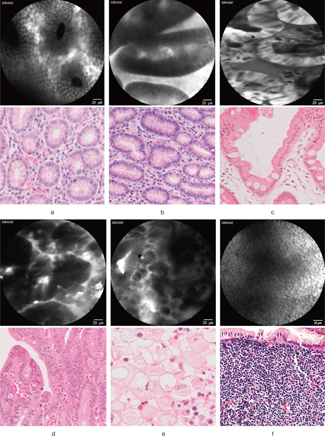 筆者が経験した胃の特徴的なCLE画像を提示する(Figure 6).H. pylori陰性の正常胃底腺領域ではFigure 6-aのような円形の腺窩を認め,幽門腺領域ではFigure 6-bのような腺構造を認める.腸上皮化生粘膜では明瞭な腺構造の中に,粘液を有した杯細胞が黒色暗調の細胞として散在して観察される(Figure 6-c).分化型癌では黒色暗調の不整な腺構造が認められ(Figure 6-d),未分化型癌では腺構造を認めなくなり,大小不同の黒色暗調細胞をびまん性に認めるようになる(Figure 6-e).胃MALTリンパ腫においては均一な細胞が密に存在した画像として観察される(Figure 6-f).