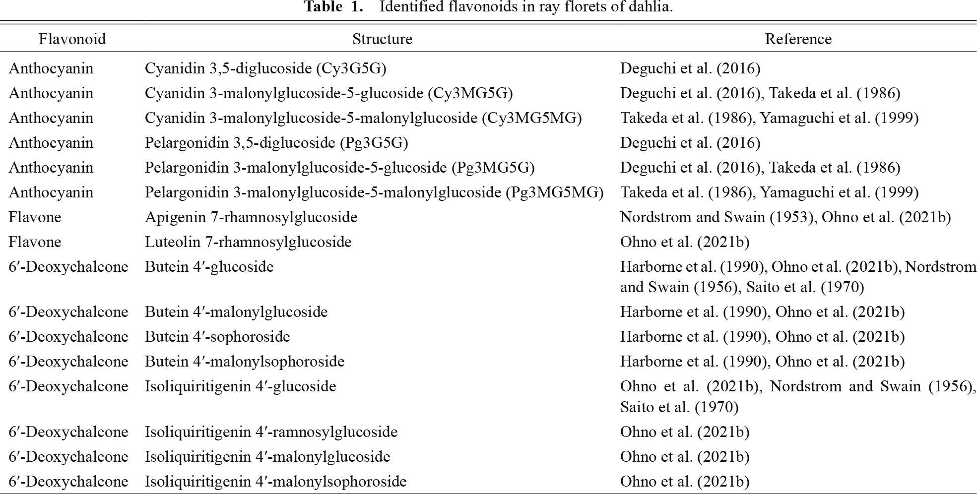 Dahlias have a wide variety of flower colors, and the National Dahlia Society classifies dahlia flowers into 17 colors (white, yellow, orange, bronze, flame, red, dark red, pink, lilac, lavender, mauve, purple, wines, violets, blends, bicolored, and variegated) (https://www.dahlia-nds.co.uk/about-dahlias/classification/). These flower colors have been the subject of many studies over the years (Bate-Smith et al., 1955; Broertjes and Ballego, 1967; Deguchi et al., 2016; Forkmann and Stotz, 1984; Harborne et al., 1990; Hazama, 1953; Lawrence, 1929, 1931a, b; Lawrence and Scott-Moncrieff, 1935; Nordström and Swain, 1953, 1956, 1958; Ohno et al., 2016, 2021b; Price, 1939; Saito et al., 1970; Singh et al., 1970; Tammes and Groeneveld-Huisman, 1939). Lawrence and his colleagues published a series of scientific papers on the genetics and cytology of dahlias (Lawrence, 1929, 1931a, b, c; Lawrence and Scott-Moncrieff, 1935). Based on numerous crossing experiments, they proposed that four genetic factors control dahlia flower color: A (light anthocyanin), B (heavy anthocyanin), I (ivory flavone), and Y (yellow flavone) (Lawrence and Scott-Moncrieff, 1935). They also predicted another factor, H, a yellow inhibitor (Lawrence and Scott-Moncrieff, 1935). As time progressed, the identification of floral pigments also progressed. Price (1939) reported a yellow flavonoid, butein (2′,3,4,4′-tetrahydroxychalcone), in dahlia ray florets. This discovery was the first report on the presence of butein in nature. Nordström and Swain (1953, 1956) reported the structures of flavones (apigenin and luteolin) and chalcones. Subsequently, the detailed structure of chalcones were identified as 4′-glucoside derivatives (Harborne et al., 1990; Ohno et al., 2021b). Also, the detailed structure of anthocyanins contained in flowers were identified as pelargonidin 3,5-diglucoside (Pg3G5G), pelargonidin 3-malonylglucoside-5-glucoside (Pg3MG5G), pelargonidin 3-malonylglucoside-5-malonylglucoside (Pg3MG5MG), cyanidin 3,5-diglucoside (Cy3G5G), cyanidin 3-malonylglucoside-5-glucoside (Cy3MG5G), and cyanidin 3-malonylglucoside-5-malonylglucoside (Cy3MG5MG) (Table 1; Deguchi et al., 2016; Takeda et al., 1986; Yamaguchi et al., 1999). As for flavones, apigenin 7-rhamnosylglucoside and luteolin 7-rhamnosylglucoside were identified in ray florets (Table 1; Nordström and Swain, 1953; Ohno et al., 2021b).