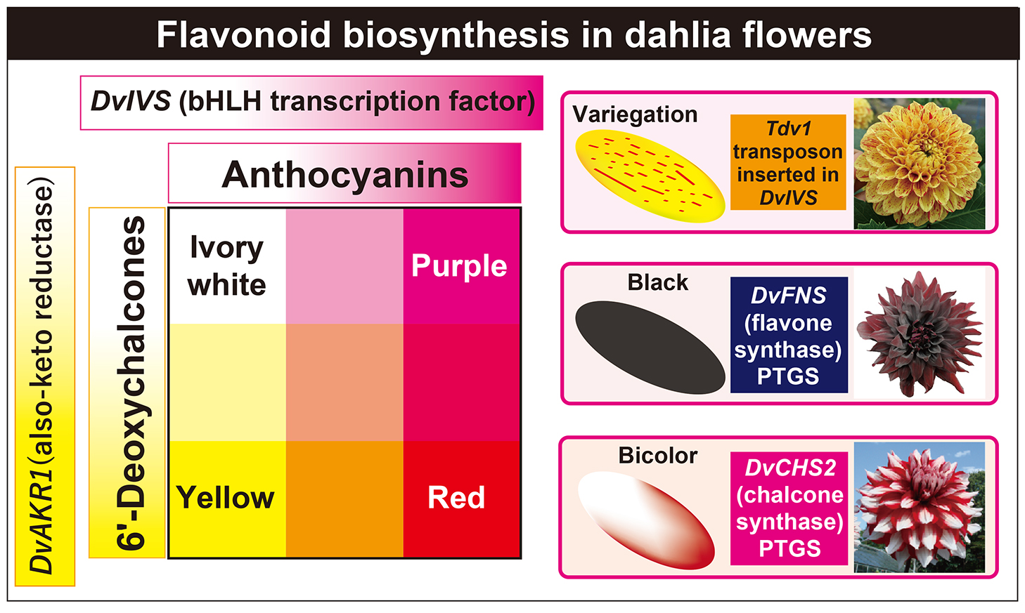 One of the characteristic flower colors of dahlia is blackish, and this color is important in floriculture because a similar color with such a gorgeous appearance is not found in other species. Generally, black coloration is due to the accumulation of blackish pigments, high pigment content or accumulation of both anthocyanin and carotenoids. In dahlias, black flower color is due to the first two factors, accumulation of blackish pigments and high pigment content, especially high accumulation of cyanidin-based anthocyanins. Dahlia mainly accumulates four anthocyanins, Pg3G5G, Pg3MG5G, Cy3G5G, and Cy3MG5G, and among the four major anthocyanins, only Pg3MG5G had a bright color, whereas the other three anthocyanins had a dark color when they were resolved in a phosphate–citrate buffer solution (Deguchi et al., 2016). Usually, dahlia accumulates more 3MG5G-type anthocyanins than 3G5G-type anthocyanins; therefore, cultivars with a high Cy/Pg ratio and an abundant amount of anthocyanins can have a black appearance. In most black cultivars, these conditions were satisfied with post-transcriptional gene silencing (PTGS) of the flavone synthase (FNS) gene because DvFNS suppression removes substrate competition between anthocyanins and flavones, and all substrates are thought to be used only for anthocyanins (Deguchi et al., 2013, 2015). DvFNS expression is also involved in color fading of red ray florets in ‘Nessho’ and ‘Color Magic’, which exhibit color fading from autumn to spring in response to low temperatures (Kase et al., 2024; Muthamia et al., 2024; Okada et al., 2020; Suzuki et al., 2010).