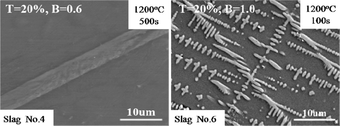 The SHTT was applied to in situ observe the crystallization of the samples. Among all the samples, slag No. 1 was held at the temperature range of 1000°C to 1300°C for 30 min, and no crystallization was observed. Thus the slag No. 1 would not be discussed in the following sections. Figure 1 showed the in-situ observed images of the slags at 1200°C. It can be seen that two types of Ti-enriched crystals, rod-structured crystal and hill-like crystal, were observed in the slag melts. And it was noticed that the type of the crystals was mainly determined by the basicity of the samples. When the basicity was 0.6, the rod-structured crystal was formed in the slag melt. With the basicity increasing to 0.8, the hill-like crystal and the rod-structured crystal appeared simultaneously. And when further increasing the basicity to 1.0, the hill-like crystal became the only crystals in the slag. Thus it can be concluded that lower basicity was favorable for the formation of rod-structured crystals.