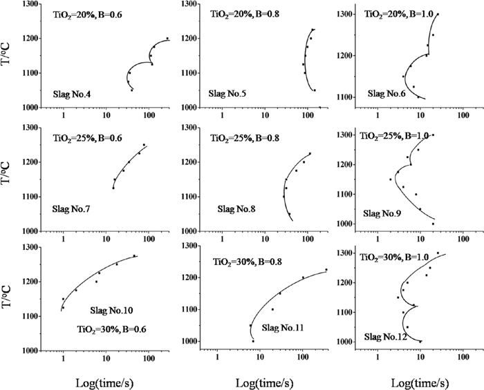 Moreover, it was seen that the TTT diagram of slag No. 4, No. 6, No. 9 and No. 12 showed double-C shape, which may imply the different crystals formed or the change of the crystallization mechanism at different temperatures in the samples. Combined with the in situ images observed by SHTT, as shown in Fig. 5, the different nucleation mechanism may be the reason since the morphology of the Ti-enriched crystals did not apparently change, i.e., the crystal showed heterogeneous nucleation at higher temperatures, and it transformed to homogeneous nucleation with decreasing the temperature.