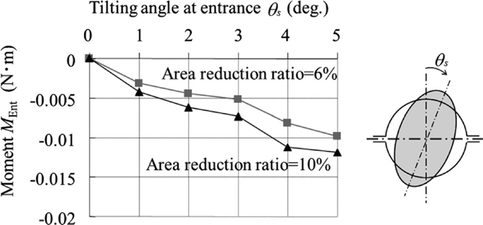 As mentioned before, tilting occurred owing to the lack of moment balance upon a slight disturbance of the roll bite. In a flat pass, the torque arms are sufficiently long for the right and left moments to balance easily. In an oval pass, because the torque arms are short, the moment balance can be easily lost upon even a slight disturbance of the roll bite, as shown in Fig. 13. In the steady-state analysis, the initial tilting angle θs is intentionally fixed in the pre-deformation zone of the second pass, assuming that θs corresponds to the rotation of the wire in the first pass and in the region between the first and second passes. The steady-state plastic deformation and external twisting moment at the entry plane MEnt were calculated under this assumption, as shown in Fig. 14. The likelihood or ease of tilting after the second pass is evaluated using the positive twisting moment MEnt. The total moment acting on the wire MTotal is