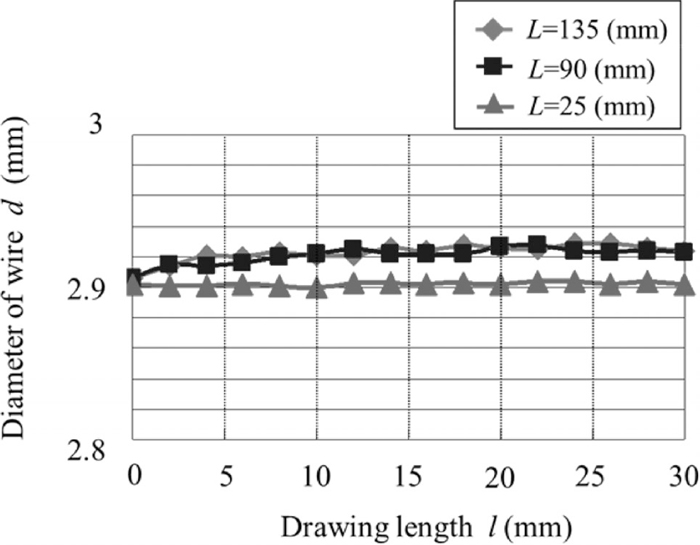 Figure 10 shows the relationship between the distance between adjacent rollers L and the tilting of a 4-mm-diameter wire. Figure 10(a) shows that when L was 166 mm, the drawing force was constant, but when L was 196 mm, the drawing force gradually decreased, as shown in Fig. 10(b). The maximum allowable distance between the rollers without the occurrence of tilting was 166 mm for a 4-mm-diameter wire. For a 3-mm-diameter wire, the distance was 131 mm, and for a 1-mm-diameter wire, the distance was 40 mm. From these experiments, the relationship between wire diameter d and the distance between two pairs of rollers L at the initiation of tilting can be expressed as