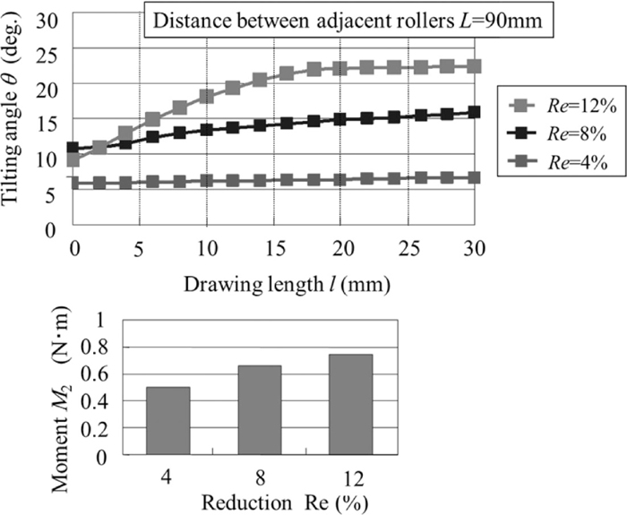 The twisting moments imposed in the roll bite of the first and second passes are shown in Fig. 21, where L = 90 mm and the reductions in the first and second passes Re are 4% and 8%, respectively. The twisting moment imposed on the wire in the first pass M1 was constant because the initial shape of the wire remained circular despite tilting. M1 is about –0.05 N·m, which is about three times as large as the corresponding value obtained by steady-state analysis MEnt, discussed in the previous section. This difference is due to the difference in the rolling conditions used and the obtained tilting angle in both analyses. The twisting moment imposed on the wire in the second pass M2 increased as the tilting angle increased, as illustrated in Fig. 19. As the top of the wire was fully constrained in the non-steady-state analysis, the moment acting on the top of the wire may affect M2, as shown in the moment diagram in Fig. 21. Note that the moment acting on the wire between adjacent rollers was the moment imposed in the first pass, M1 or MEnt in the previous section. With the aim of demonstrating the effect of the moment imposed in the second pass M2 and the gradual change in the final tilting angle θ when the top of the wire is fully constrained, we next investigate the evolution of the final tilting angle θ as a function of M2.