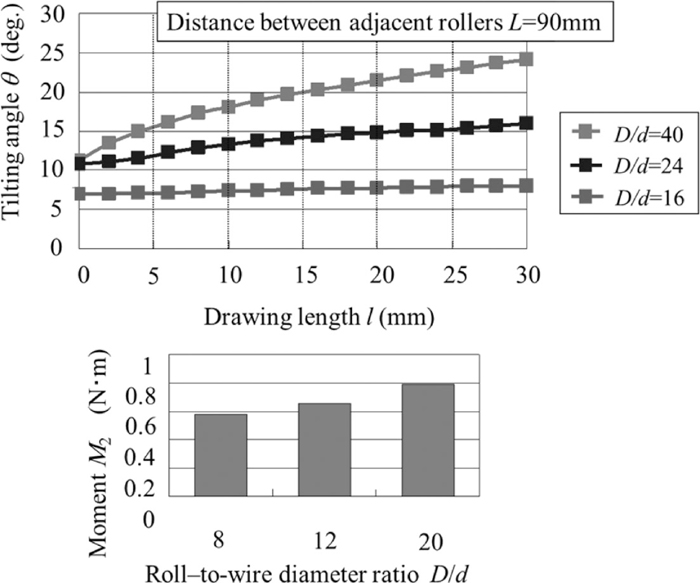 Figure 22 shows the relationship between the drawing length and the tilting angle, and between the area reduction ratio and the tilting moment, where L = 90 mm. As the area reduction ratio decreased, the contact area between the roll and the wire and the tilting moment upon rolling decreased. The area reduction ratio of 4% results in a small tilting angle being maintained and enables the fabrication of a precise wire. Figure 23 shows the relationship between the drawing length l and the final tilting angle θ as a function of the roll-to-wire diameter ratio D/d, where L = 90 mm. As D/d decreased, the contact area between the roll and the wire decreased, and thus the twisting moment decreased. When D/d is below 16, a small tilting angle can be maintained, enabling the sound fabrication of a precise wire.