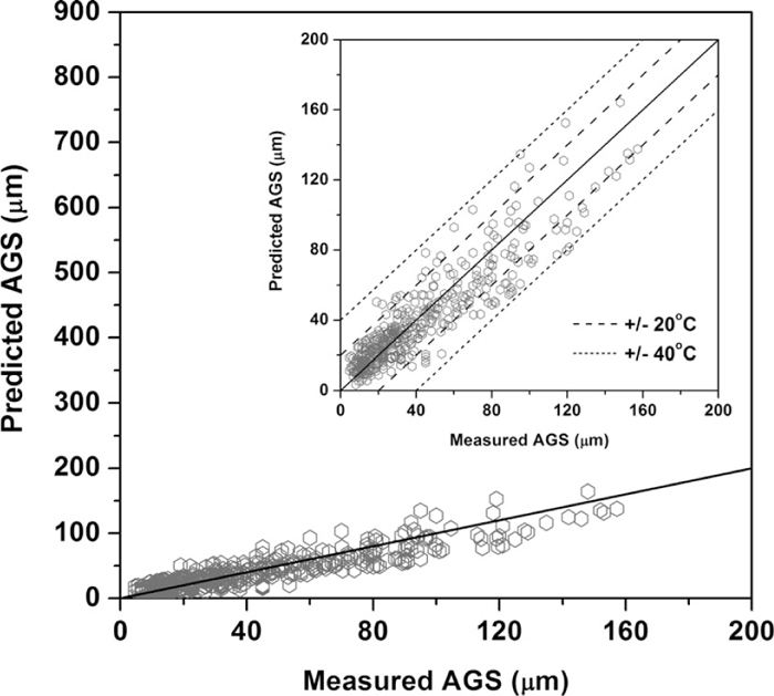 Figure 1 compares previous models in predicting the literature data on AGS given in Table 1 that was used to derive Eq. (8). These models distinctly overestimate the AGS in steels containing precipitate-forming elements, implying that the previous models cannot represent the effect of precipitate-forming elements in inhibiting austenite grain growth. However, the new proposed model predicts these data well as shown in Fig. 2; that is, the model successfully reproduces the experimental data that was used to optimize its parameters. All experimental data are predicted within an acceptable error range of ±40°C and most of the data (401 of 457) are accurately predicted within a narrow error range of ±20°C.
