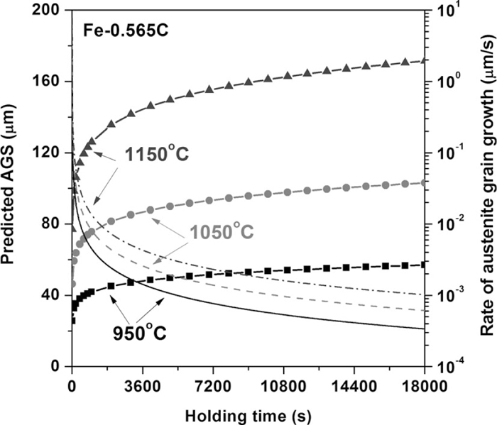 Predicted grain size variation (with symbol) and growth rate (without symbol) of austenite at different reheating temperatures.