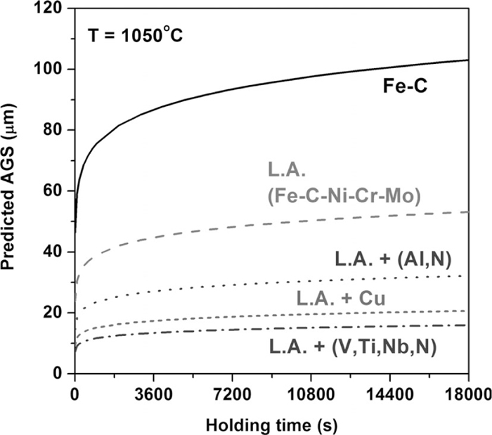 Precipitate-forming elements such as Nb, Ti, V increase strength through the formation of carbides or nitrides and suppress the growth of austenite grains, improving strength through the Hall-Petch effect.1,2,3,4,5,6,8,9,10,11,12,13,14,15,16,18,23,25,26,27) Among the models previously reported to predict austenite grain growth, few have considered the influence of the precipitate-forming elements in alloy steels. In the present work, a model was developed to predict the austenite grain growth during reheating including the effects of various alloying elements.