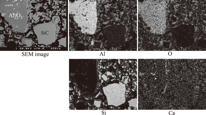 The element distribution of the sample was mapped using SEM-EDS. As shown in Fig. 2 calcium originally present in the slag was detected in the bulk of the used refractory samples especially along the surface and cracks of large porous alumina aggregates, and the pores between small dense particles. The SEM images of porous alumina aggregates and dense SiC particles are illustrated in Fig. 3. This is a good indication that the slag but not the metal penetrated deeply into the refractory lining during service. This is supported by the observation near the interface of the refractory, slag and metal as shown in Fig. 4. The slag wets the refractory well with some distributed in the bulk refractory. Slag component calcium is found only outside but not inside the dense fine SiC particles. Metal iron is present on the top of the slag layer implying that the refractory degradation is caused mostly by the molten slag rather than by the metal.