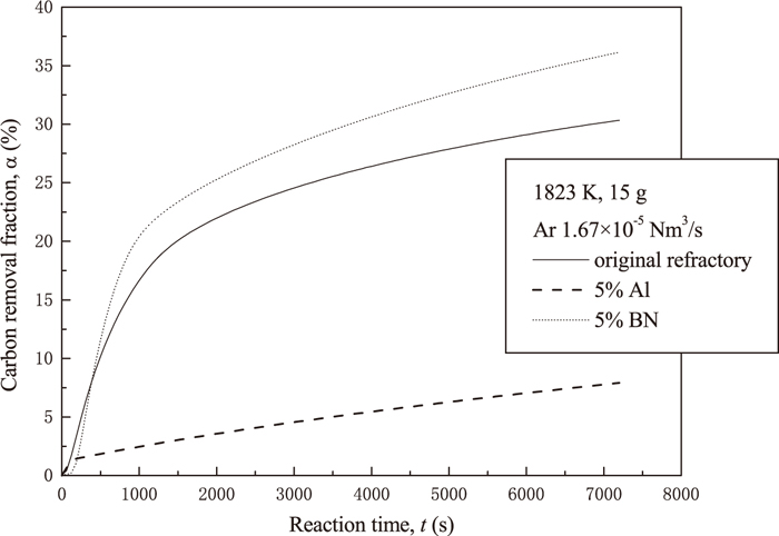 The changes of α value with reaction time for various samples are graphed in Fig. 7. The sample with 5% BN addition lost more carbon than the standard sample. However, in the case of 5% Al addition, only a small amount of CO and CO2 gas could be detected in the initial 200 s, and then almost no gas came out from the sample. This indicates that Al addition suppresses gas generation and consequently reduces the carbon removal from the refractory sample efficiently.
