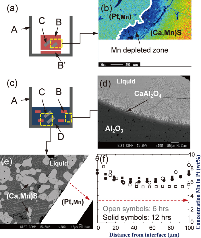 Experimental details and results. (a) A schematic figure of sulfide/Pt/gas equilibrium experiment, (b) Mn concentration mapping result in a sample obtained by the sulfide/Pt/gas equilibrium experiment, c) a schematic figure of flux/sulfide/Pt/gas equilibrium experiment, (d) and (e) micrographs of the sample obtained by the flux/sulfide/Pt/gas equilibrium experiment at 1400°C, and (f) composition analysis of Mn in the Pt foil. Legend: A: alumina or graphite crucible, B: sulfide pellet, B’: sacrificing sulfide, C: Pt foil, D: flux (Online version in color).
