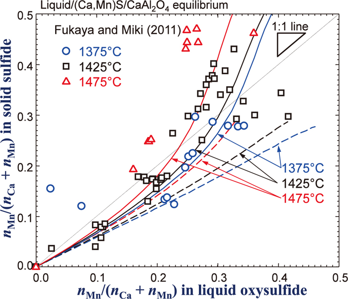 As mentioned in Sec. 2.4, a positive interaction between CaS and MnS in the liquid phase was introduced. Dashed lines shown in the Figs. 7 and 8 are corresponding calculations assuming the ideal mixing between CaS and MnS in the liquid phase. As can be seen in the figures, the calculations are not in good agreement with the experimental data. As Ca2+ and Mn2+ cations exhibit positive deviation from ideality which has been reported in (Ca,Mn)O solid, (Ca,Mn)S solid, several (Ca,Mn) solid chalcogenides (selenide, and telluride),23) and liquid CaO–MnO,16) it is likely to have a similar positive interaction between the Ca2+ and Mn2+ cations in the liquid sulfide solution. In fact, other available model parameters were also tested in order to check whether it could improve the agreement between the experimental data and the model calculation. However, all other possible attempts were not in success. Only introduction of the positive interaction between the CaS and MnS was successful. It results in better agreement in Figs. 7 and 8, although a worse agreement was obtained in the phase diagram calculation shown in Fig. 1. In the present study, more weight is given in the experimental data in Figs. 7 and 8.
