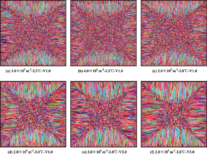 The simulated solidification structure of transverse section under different maximum nucleation densities, different mean nucleation undercoolings and dendrite growth velocities.