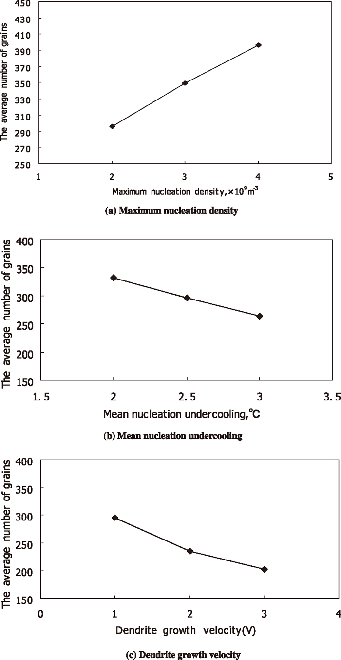 In addition, it has been found that the compactness degree of longitudinal section of the outer columnar grain zone is increased with the increase of maximum nucleation density, and is decreased with the increase of mean nucleation undercooling on the basis of Figs. 9(a) and 9(b). That is to say, the average grain number of longitudinal section of the outer columnar grain zone is increased when increasing the number of new nucleation cores in the solidification front of the grains during the solidification process. So the nucleation conditions can have an obvious effect on the compactness degree of longitudinal section of the outer columnar grain zone. Meanwhile, if the temperature gradient in the solidification front of outer columnar grain zone is increased, the undercooling volume in the solidification front will be decreased, and the number of new nucleation cores in the solidification front of the columnar grains during the solidification process will be decreased. Consequently, the change of the number of new nucleation cores in the solidification front of the grains may be another reason that the average temperature gradient of the solidification process of the outer columnar grain zone can make the average grain number of longitudinal section of the outer columnar grain zone different.