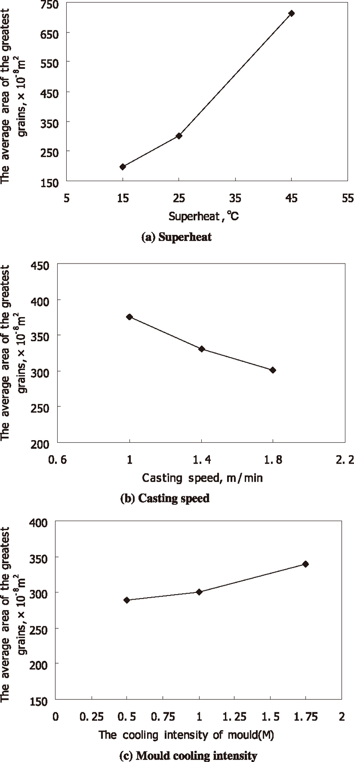 In order to verify and explain the above phenomenon, the greatest grain areas of longitudinal section at different locations under different conditions were first calculated (as shown in Fig. 15), and the average values of the greatest grain area of longitudinal section of the outer columnar grain zone were compared (as shown in Fig. 16). Although the difference of the area in Figs. 15(b) and 15(c) under different conditions isn’t very clear, the average value of the greatest grain area of longitudinal section of the outer columnar grain zone can reflect the trend of the change. From Fig. 16, the average value of the greatest grain area of the outer columnar grain zone is increased with the increase of superheat, and is decreased with the increase of casting speed, and is increased with the increase of mould cooling intensity. Because the greater the grain area, the smaller the grain number, this trend is in good agreement with the relationship between the relevant temperature gradient and the relevant grain number. That means this kind of relationship does exist.
