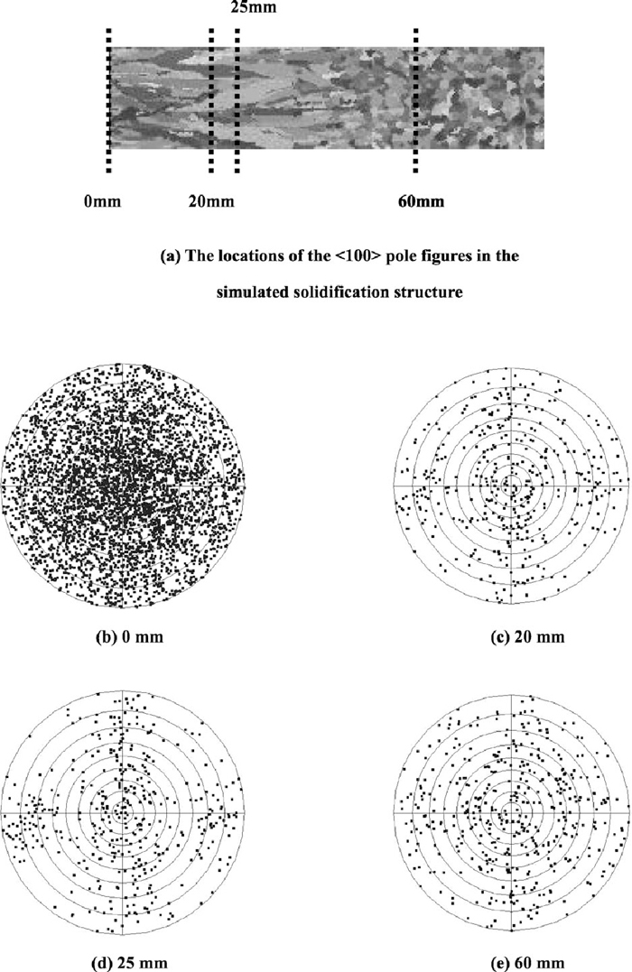 Moreover, the <100> pole figures at different locations of Fig. 6(b) were obtained by the ProCAST software, as shown in Fig. 17. As seen from the figure, the <100> points are almost randomly distributed in Fig. 17(b), which means that the crystallographic directions are random in the chill zone of billet.29,30) This feature was also found in the central equiaxed grain zone by analyzing Fig. 17(e). However, the pole figures in the columnar grain zone of billet are different from the previous pole figures. In Figs. 17(c) and 17(d), the <100> points are not randomly distributed, and these points are clustered in left, right, up, down and center parts (especially in the center part). So many of the grains at these locations have one of their <100> directions most closely aligned with the thermal gradient and it is the result of grain selection.29,30) In the present work, the preferential <100> growth directions of grains was accounted for simulating the solidification structure of continuous casting billet, and the assumption is reasonable for cubic metals.31) In addition, this assumption is the reason why the occurrence of the equiaxed-columnar transition between the chill zone and the columnar zone can be predicted by the CAFE method.7)