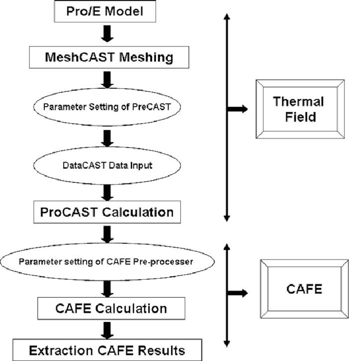 The flowchart of the simulation process is shown in Fig. 2. The three-dimensional grid model was first established by using PRO/E software, then the thermal field was calculated by ProCAST, and finally the solidification structure was simulated by the CAFE calculation. The CAFE model is one module of the ProCAST software. The FE mesh was used to calculate the heat transfer process and the CA cell (much smaller grid) was used to calculate the grain growth process. To predict simultaneously the microstructure development as a function of the thermal field and the influence of the latent heat release of the grains on the calculated thermal history, interpolation coefficients were defined between nodal points of FE mesh and CA cells in order to combine the FE and CA calculation in a single model, as shown in Fig. 3.8)