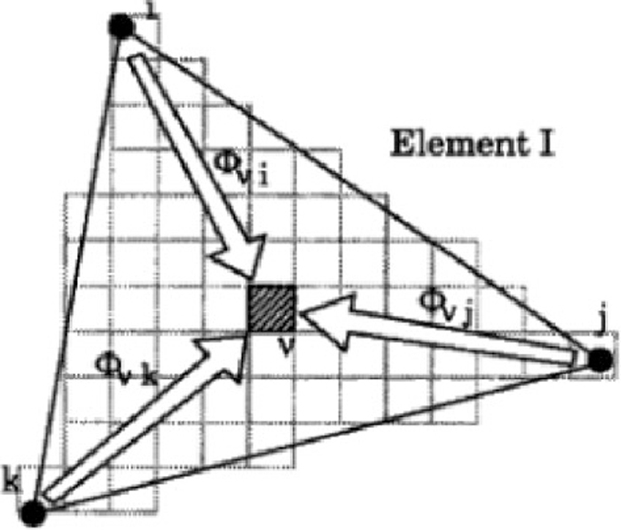 In Fig. 3, the CA cell, V, with its centre in finite element I, has non-zero interpolation coefficients ΦV, i, ΦV, j and ΦV, k with FE nodes i, j and k, respectively. New nucleation is formed in the bulk volume when the local temperature of nucleating cell is below the critical temperature in the given time step. Then nucleation model and dendrite tip growth kinetics are used for simulating the solidification structure based on the cellular automaton platform.7,8) Crystallographic orientation of crystal growth is randomly chosen from predefined orientation classes, and the crystallographic orientation <100> is selected preferentially.7)