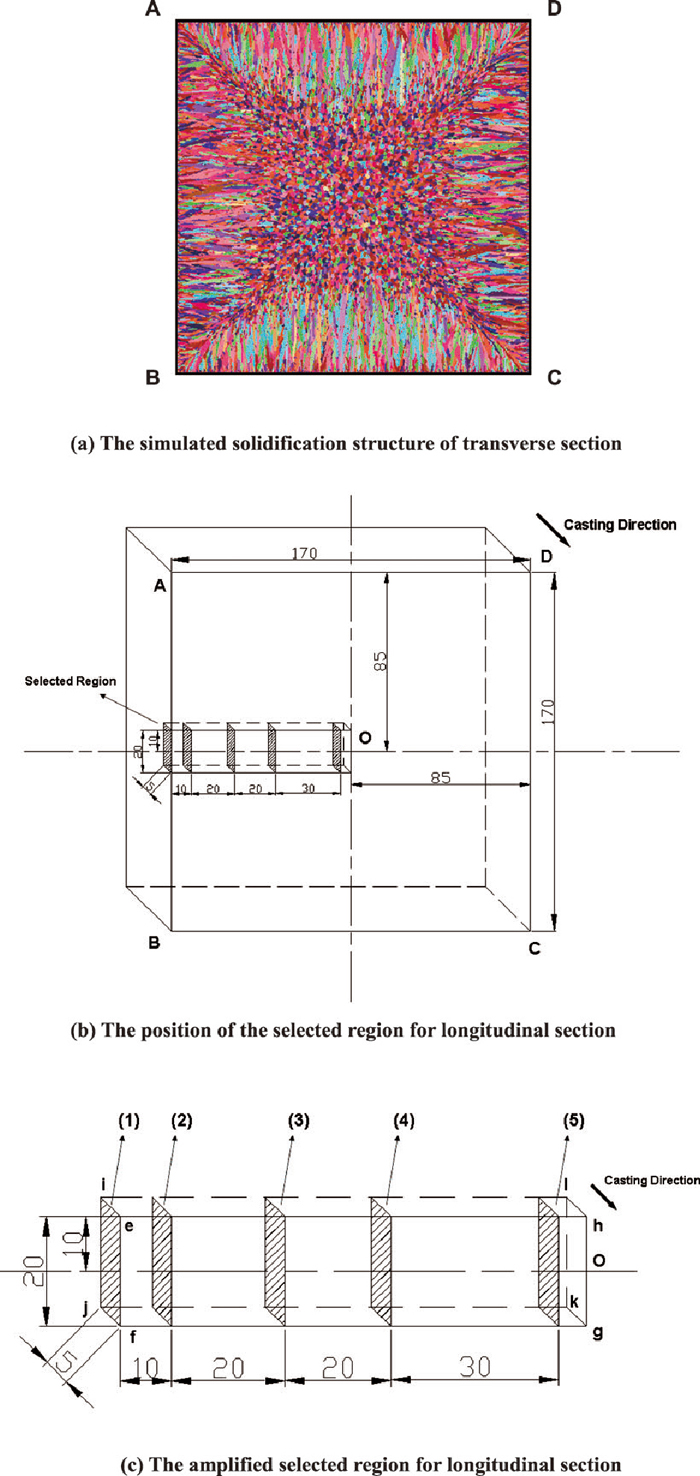 The simulated solidification structure of transverse section and the selected region for longitudinal section in continuous casting billet (unit: mm).
