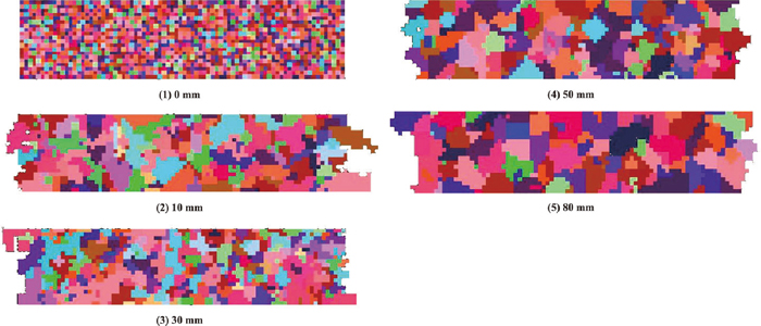 On the basis of the above validation, the compactness degrees of longitudinal section from the surface to the center of billet under different conditions were first compared, and then the outer columnar grain zone was presented specially. In order to get some more general conclusions, the solidification structure without MEMS was used as the benchmark for research. Figure 4(a) shows the simulated solidification structure of transverse section of billet. The relevant parameters are as follows: the superheat is 25°C, the casting speed is 1.8 m/min, the mould water amount is 135 m3/h, the maximum nucleation density is 2.0×109 m–3, the mean undercooling is 2.5°C, the parameters in the dendrite growth model, a2 and a3, were determined as 0 and 1.356×10–5 m/(s·K3). For comparing and calculating easily, the studied region was selected as shown in Fig. 4(b). The position of the solidification structure in Fig. 4(a) can be found in Fig. 4(b) by the labels ABCD. The selected region in Fig. 4(b) was amplified in Fig. 4(c). As shown in Fig. 4(c), the longitudinal section is along the casting direction, and there are 86 sections obtained in the space of 1 mm for each selected region. The 2-dimensional longitudinal sections were all obtained from the 3-dimensional calculation results of the selected region by sectioning. The longitudinal sections labeled by (1), (2), (3), (4) and (5) are the sections from which to the surface of billet the distances are 0 mm, 10 mm, 30 mm, 50 mm and 80 mm, respectively. In order to reduce the calculating time, the size of longitudinal section was determined as 20 mm×5 mm (5 mm is the width of the longitudinal section along the casting direction). Figure 5 shows that the corresponding simulated solidification structures of these longitudinal sections. All the grains which are fully or partially within the section are taken in account. Because the difference of solidification condition between inner curve side and outer curve side, and the difference of solidification process along the casting direction were not only ignored in this model, but also the columnar grains in the selected region are well developed, the selected region and the relevant method are very effective for studying the compactness degree of columnar grain zone in continuous casting billet.