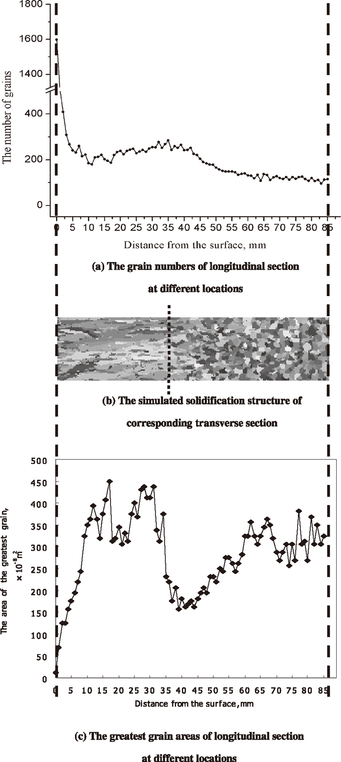 Based on the above discussion, the difference between the obtained results according to Eq. (8) and the findings of the present work can be probably attributed to two features that the established model has. The first one is the preferential growth <100> directions is accounted for simulating the solidification structure of continuous casting billet. During the solidification process of the outer columnar grain zone, especially the transition from equiaxed grain (in the chill zone) to columnar grain, the growth velocity is increased when increasing the relevant average temperature gradient, then the grains having the preferential <100> growth directions get more chances to grow for the reason that high dendrite growth velocity increases the extent of grain selection. The other one is that new nucleation cores can be formed in the solidification front of the columnar grains during the solidification process. The reason is that the normal distribution continuous nucleation model was used in the model. The number of new nucleation cores in the solidification front will be decreased when increasing the relevant average temperature gradient, then the average grain number of longitudinal section of the outer columnar grain zone will be decreased. So the change mechanism about the compactness degree of longitudinal section of the outer columnar grain zone in continuous casting billet may be different from that in net columnar grain zone where grains grow side by side and that of the central equiaxed grain zone in the billet.