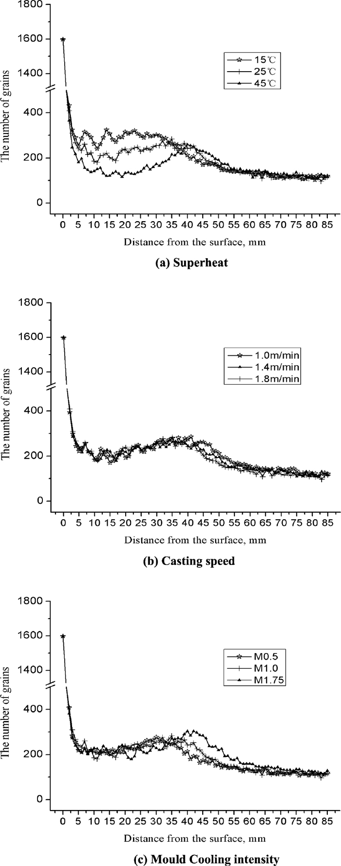 Grain numbers of longitudinal section at different locations under different superheats, different casting speeds and mould cooling intensities.