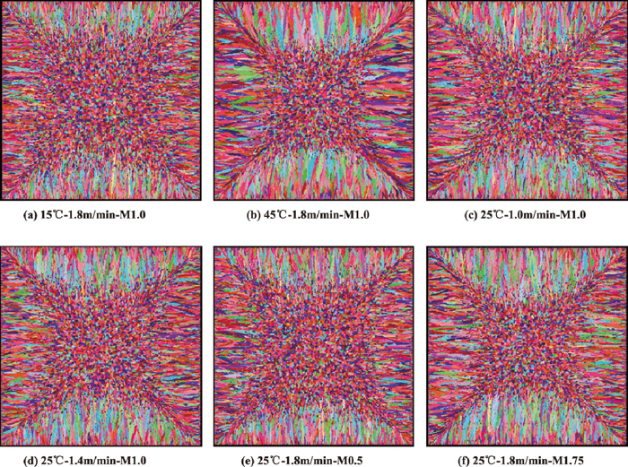 The simulated solidification structure of transverse section under different superheats, different casting speeds and mould cooling intensities.
